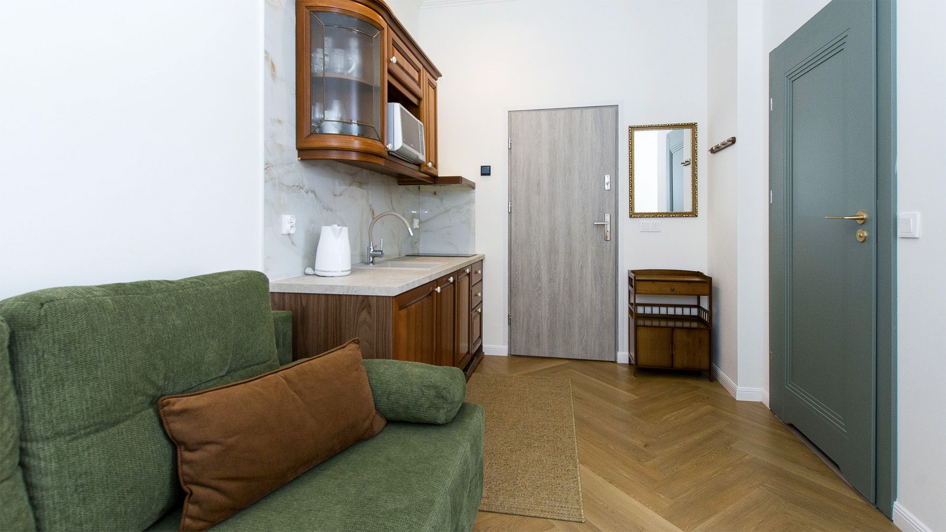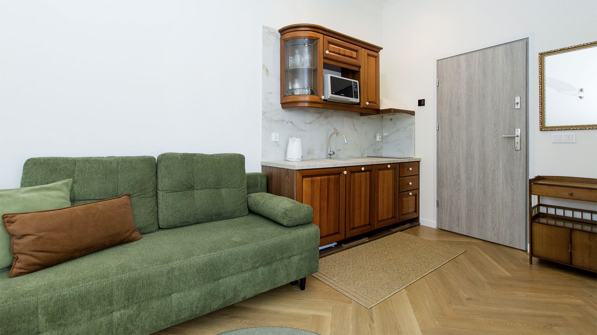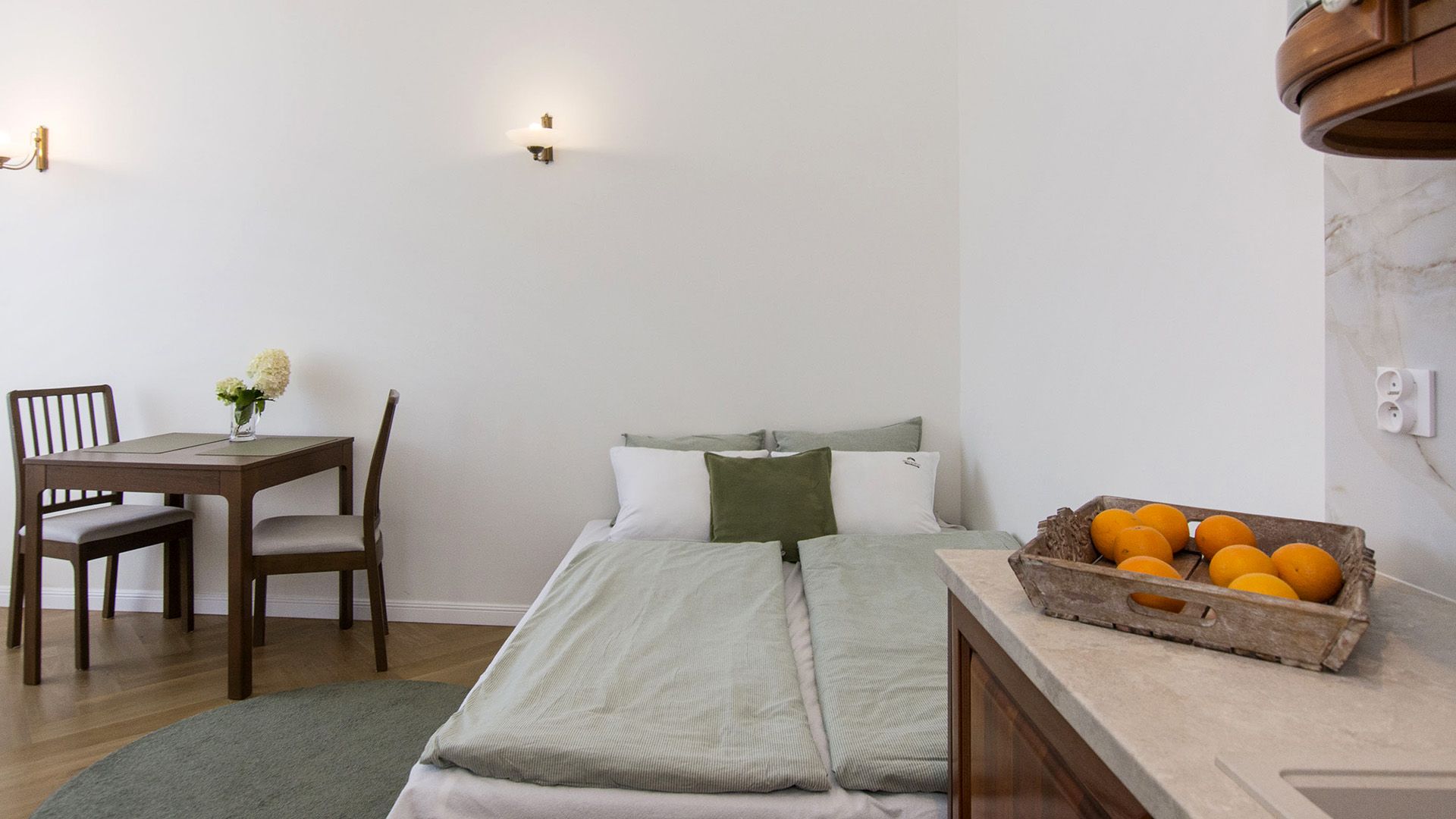 Studio z aneksem kuchennym i łazienką. Idealne na komfortowy pobyt dla dwóch osób. Mieszkanie kompletnie wyposażone zapewni gościom komfortowy pobyt. Aneks kuchenny w pełni wyposażony w sprzęt AGD, naczynia, lodówkę, zmywarkę, kuchenkę indukcyjną i mikrofałówkę. Łazienka z toaletą, prysznicem i umywalką