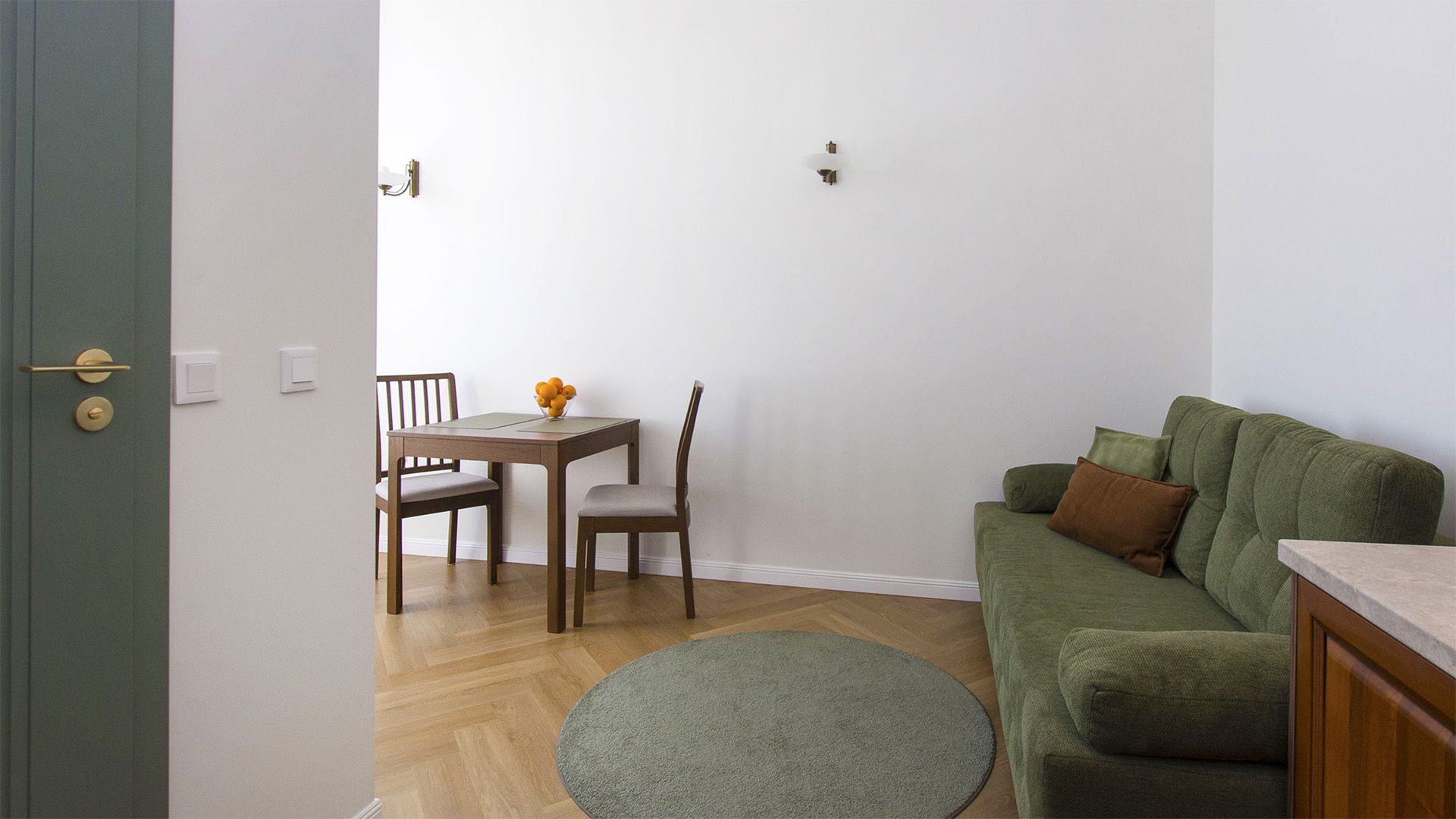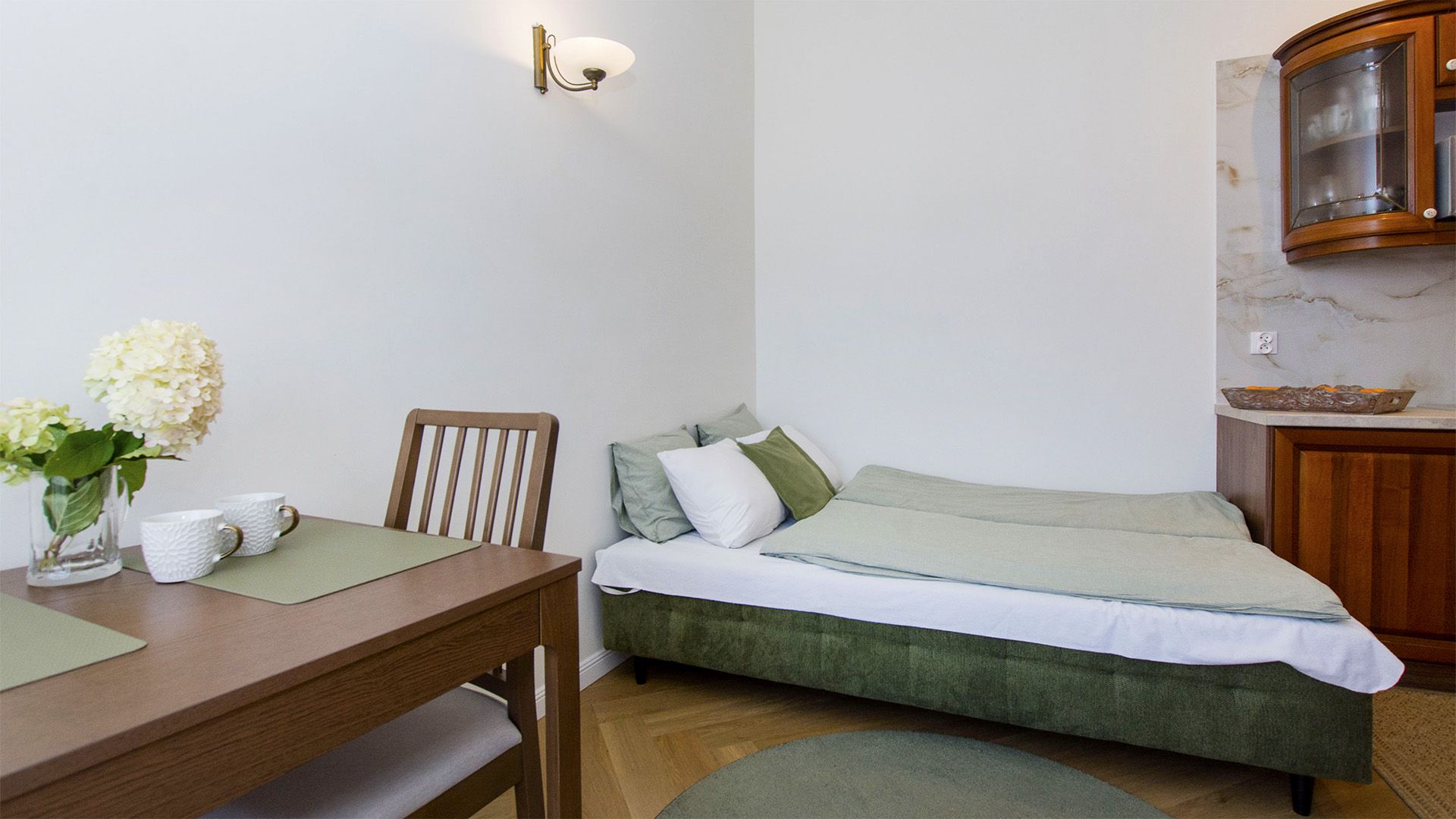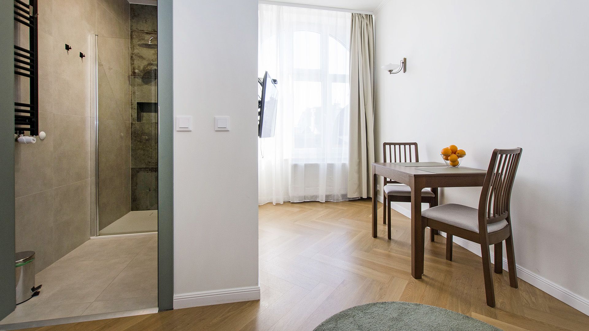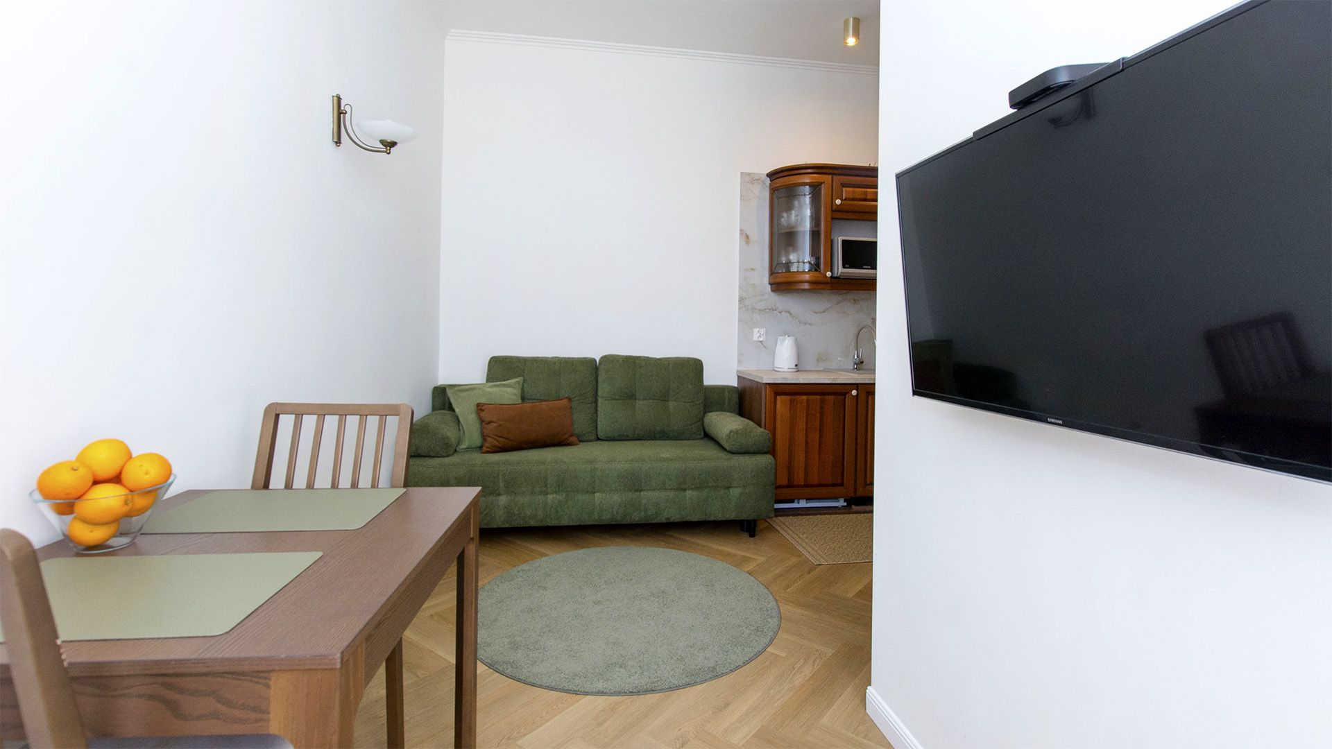 Studio z aneksem kuchennym i łazienką. Idealne na komfortowy pobyt dla dwóch osób. Mieszkanie kompletnie wyposażone zapewni gościom komfortowy pobyt. Aneks kuchenny w pełni wyposażony w sprzęt AGD, naczynia, lodówkę, zmywarkę, kuchenkę indukcyjną i mikrofałówkę. Łazienka z toaletą, prysznicem i umywalką